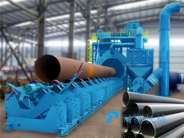 采用液壓馬達驅動,噴丸清理采用啟動馬達驅動。 我公司設計的有大管徑的內壁拋丸機和直徑600mm以下的小型鋼管噴丸機等。該設備采用自動拋丸去除表面銹蝕,利用拋丸器拋出的高速